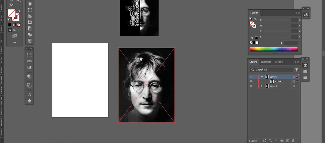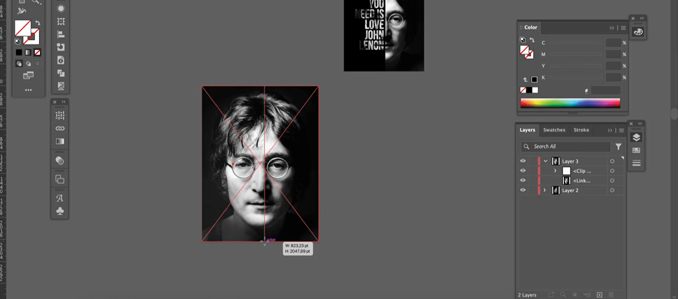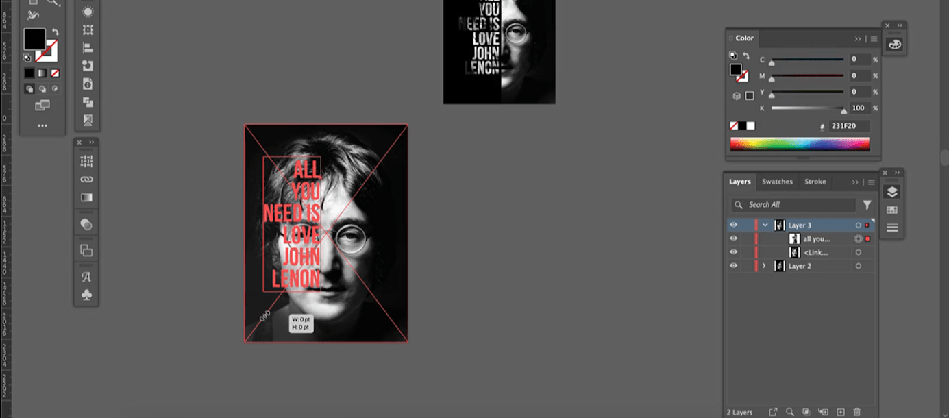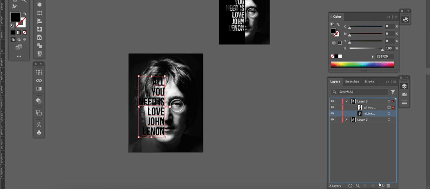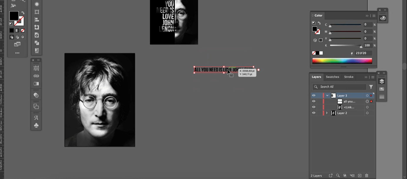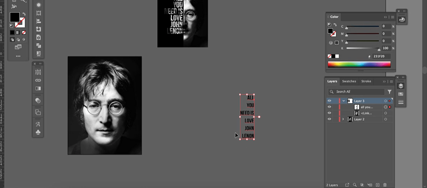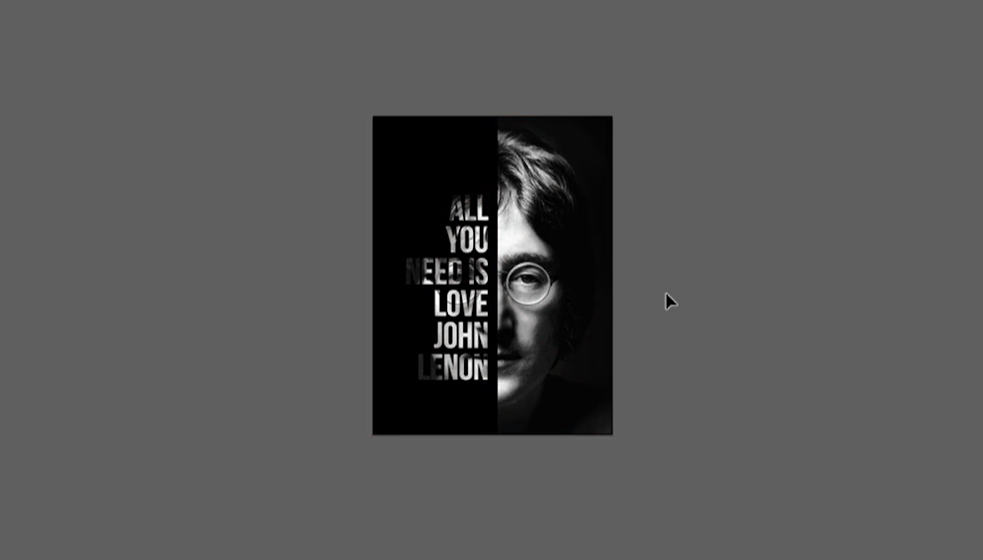 Это не обязательная часть, если вы планируете делать плакат без типографики. Но в нашем макете есть фраза «All you need is love. John Lennon», так что его можно скопировать из любого текстового файла с помощью команды Ctrl + C и Ctrl + V или набрать вручную с помощью инструмента Text.