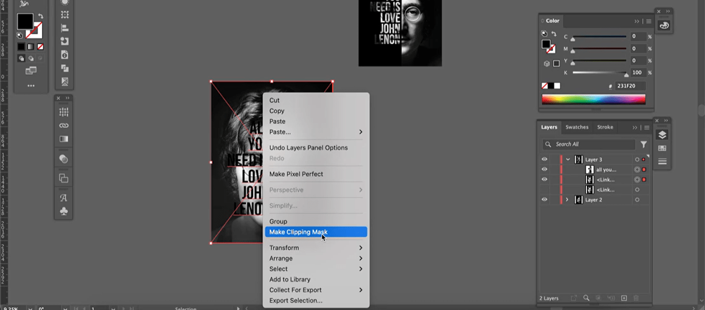 Можно создать маску с помощью клавиш Ctrl +7 или открыть контекстное меню правой кнопкой мыши и выбрать инструмент Make Clipping Mask (Создать обтравочную маску). Тогда в слое останется только та часть изображения, которая вписывается в контуры букв.